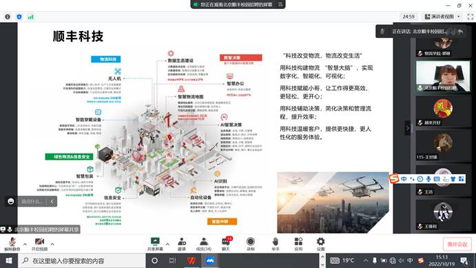 北京顺丰速运有限公司重视人才培养,学生实习期间有专人管理和辅导,实习表现优秀的学生将有机会优先签约进入公司。40位同学参加了线上宣讲会,并就上班时长、薪酬待遇等具体问题向张玲女士提问。