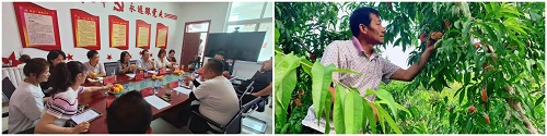 师生,梯子峪村党支部书记等人热情地准备了当地特色水果——平谷大桃。禾硕嘉总经理陶硕为师生介绍了桃子的种植技术以及如何培育现代桃产业专业化、规模化、标准化生产,强调以生产优质的农产品为抓手,实现“好桃卖好价”。希望我们可以通过朋友圈、小红书等自媒体渠道对梯子峪村大桃给予宣传和支持,帮助梯子峪村大桃打开销路,实现村民增收致富。