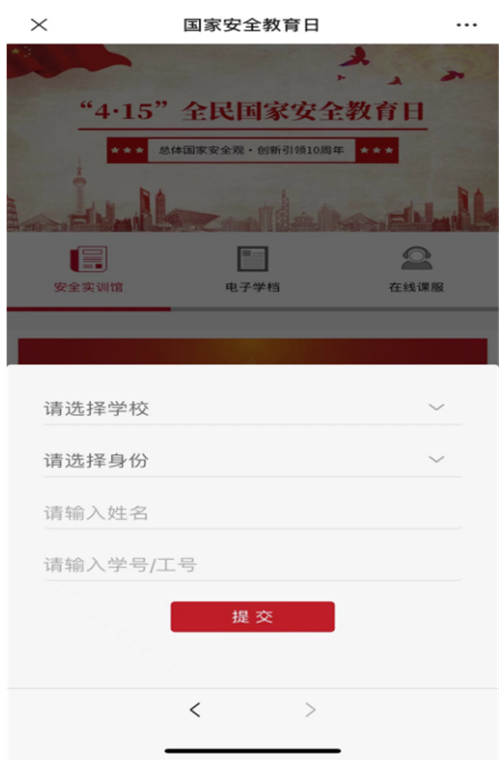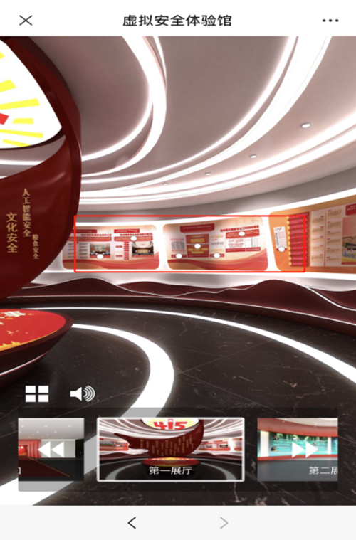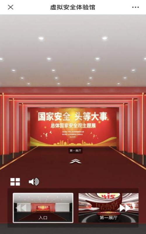 (二)点击【安全实训馆】页面,点击【实训馆参观】,进入总体国家安全观虚拟展馆参观界面,点击页面下方场景进行场景切换。