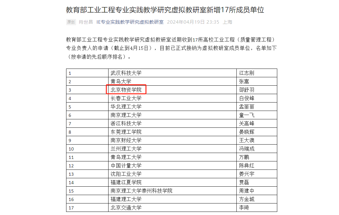 质量管理工程专业正式成为教育部工业工程类专业实践教学研究虚拟教研室成员单位。教育部工业工程专业实践教学研究虚拟教研室是经教育部工业工程类专业教学指导委员会推荐,2022年首批入选的教育部虚拟教研室建设试点。