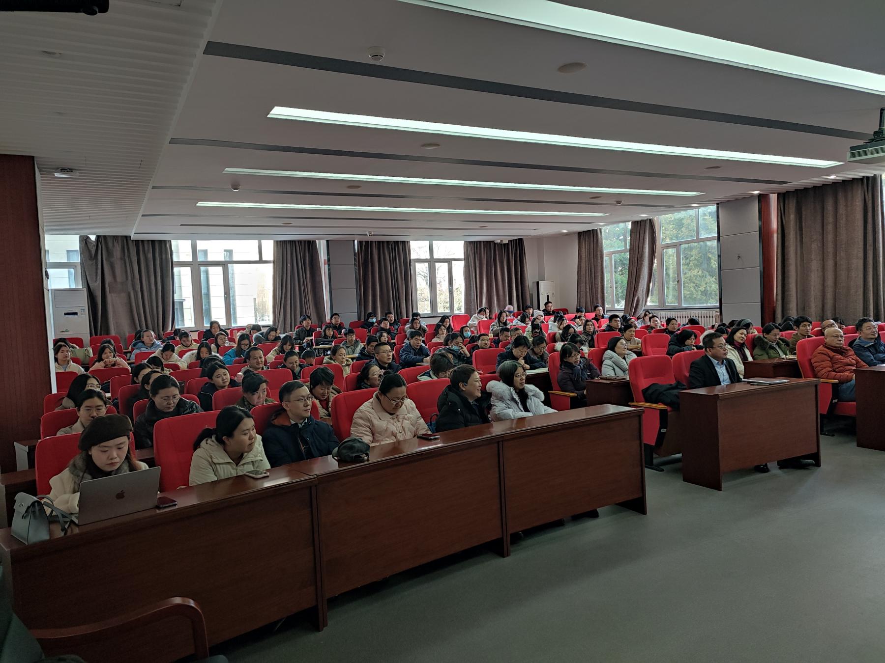 师生一百余人在知新楼第一教室参会学习。