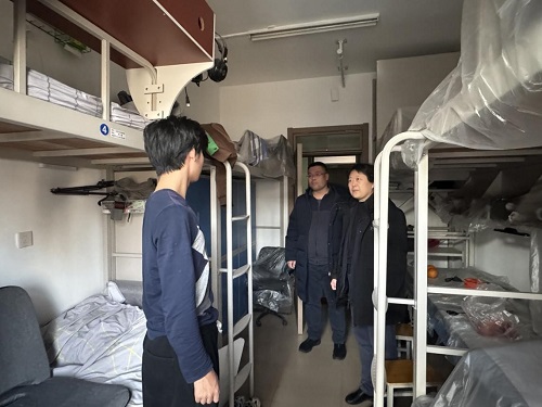 党委书记郝庆、党委副书记孙涛及辅导员穆启鹏走进学生宿舍,开展“迎新送暖”走访慰问活动,为同学们送上饱含深情的新年祝福与慰问大礼包,让学生们真切感受到学校的“年”味与学院的“家”暖 。