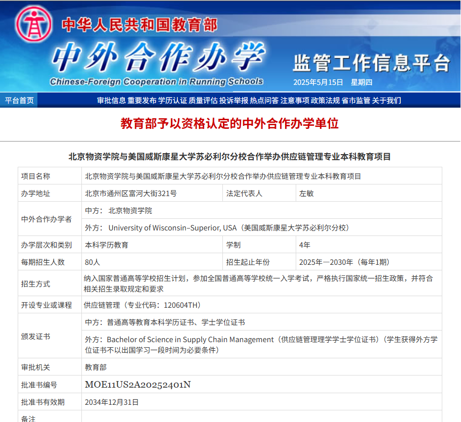 成功获批与美国威斯康星大学苏必利尔分校合作举办供应链管理专业本科教育项目(批准书编号:MOE11US2A20252401N)。这是我校持续推进国际化办学战略、深化教育教学改革的又一重要成果。