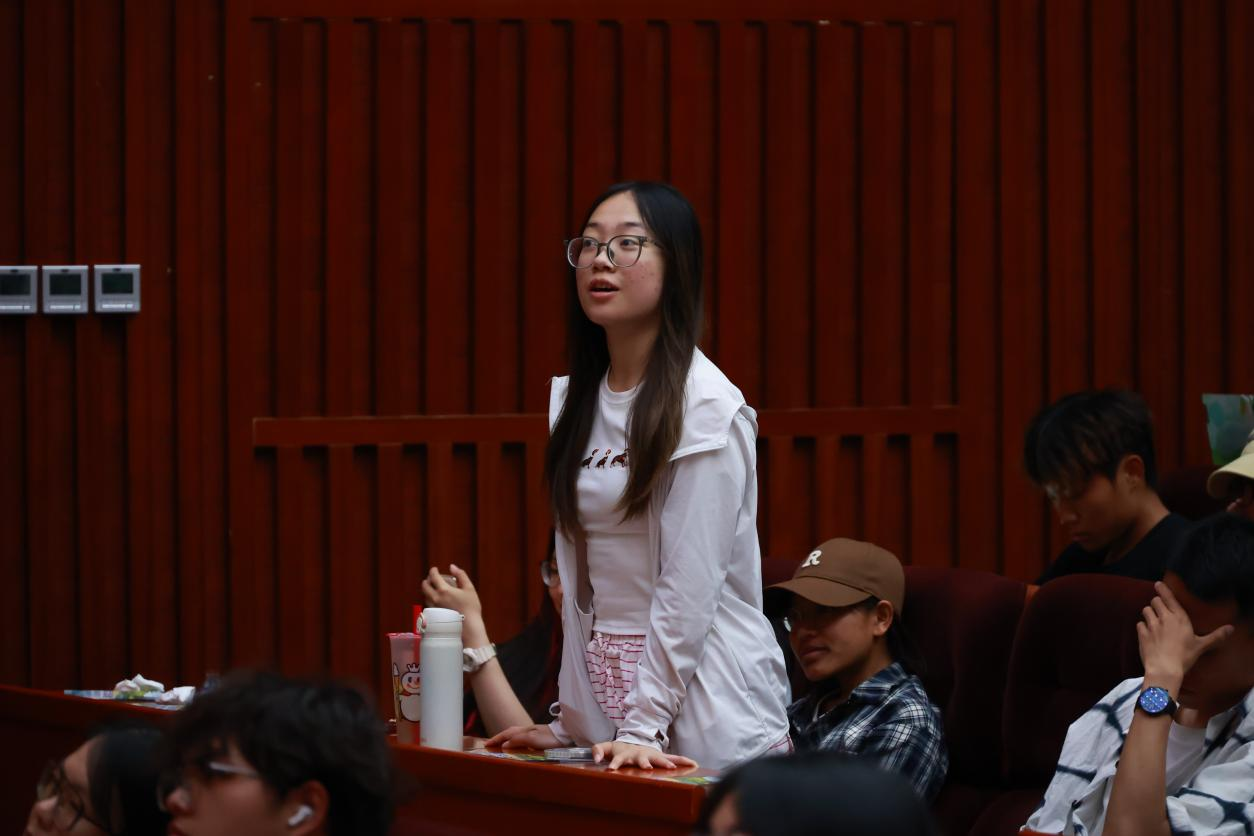 在提问交流环节,学子们围绕“理论如何对接实践”“技术颠覆性创新”“创业韧性”等话题与嘉宾展开热烈讨论。王君指出,未来十年AI或将实现全程无人温控突破,彻底重构冷链效率;李永清则强调,技术需服务于场景,中餐供应链的复杂性决定了人机协同的重要性。杨化东则分享了创业中的“危机事件”如何转化为成长契机。现场氛围活跃,思想碰撞不断。