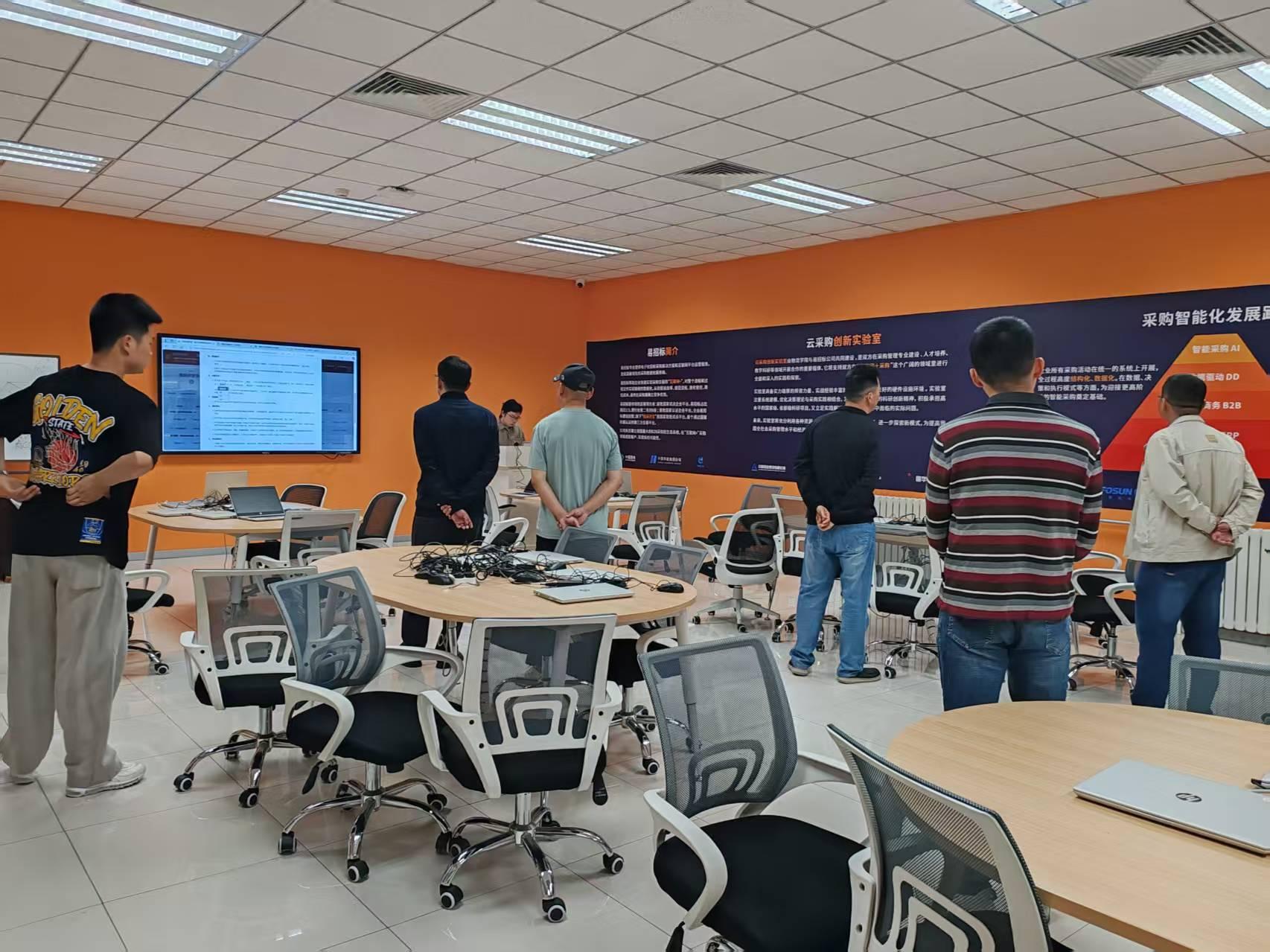 。在示范中心,介绍了示范中心基本情况,多穿系统、托盘式立库、滑块式分拣系统、AGV拣选等先进设备及智能码垛实验室、云采购实验室、VR/AR实验室、智慧供应链协同创新实验室等在内的多个教学实验室。在云采购实验室,采购管理专业2022级学生李智向军事医学研究院一行演示了易木软件等在采购专业课程学习、采购大赛中的应用。随后,走进尤物视频