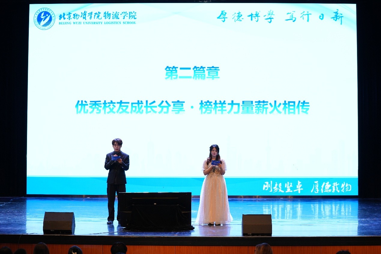 第二篇章“优秀校友成长分享・榜样力量薪火相传”,汇聚七名不同领域校友代表。侯伊卓分享顺丰大促期间的仓储系统升级实践,强调“答案就在现场”的一线精神;李鹏楠回顾求职迷茫期的选择,寄语学子“扬优势、锻长板”;刘轩宇以“接受失败,保持自信”为主线,讲述从挂科到美国企业任职的逆袭故事;刘明阳通过部队历练与冷链物流实习,揭示物流行业“技术与温度并存”的特性;杨佳怡则以答辩经验与实习案例,鼓励学弟学妹“打好专业基本功”。