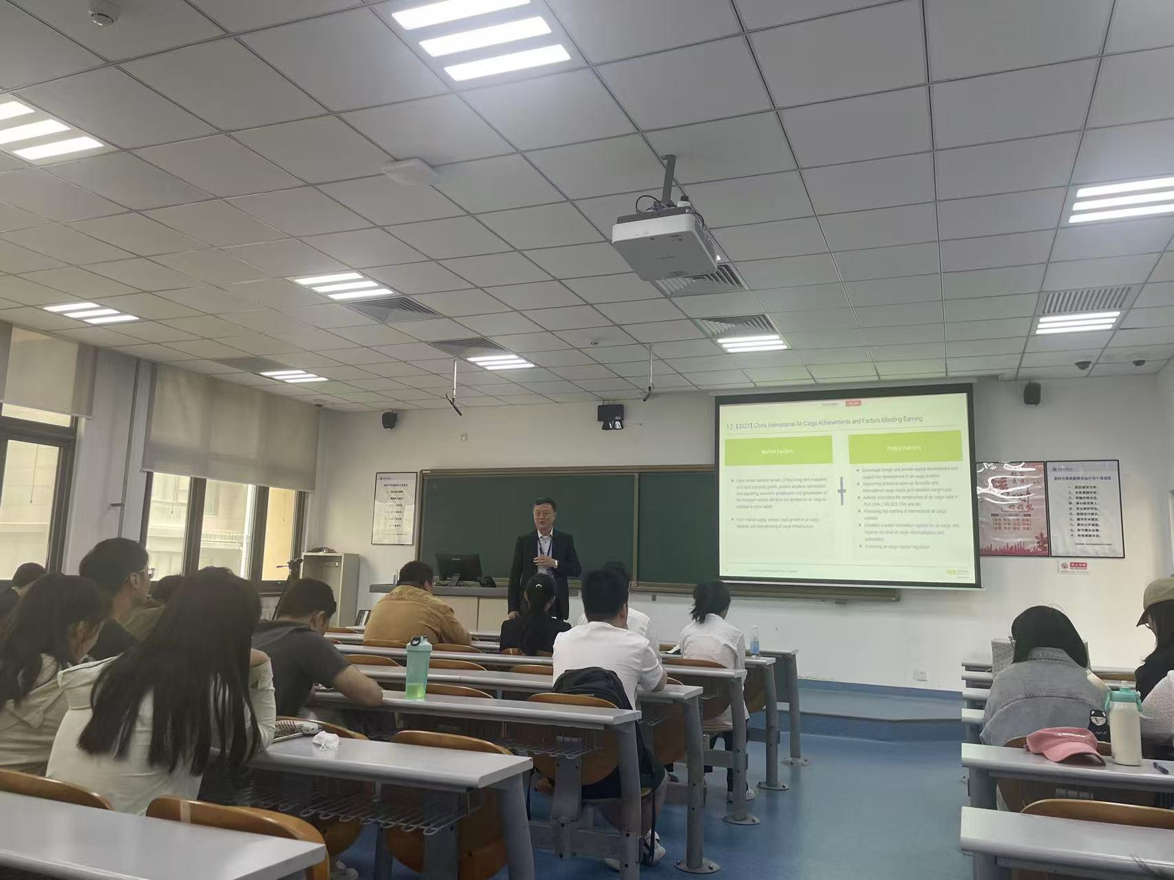 随后,李文俊副总裁以《航空物流职业技能与前沿议题》为题发表演讲,为师生带来行业一线洞察,为同学们讲解了全球航空业20年韧性发展, 解析“安全体系升级”“新冠客改货应急响应”等案例,强调动态风险管理能力对物流企业的核心价值,并讲解了收益管理技术实战应用,阐释超售四大模型,揭示如何通过数据驱动实现航班收益最大化等内容。