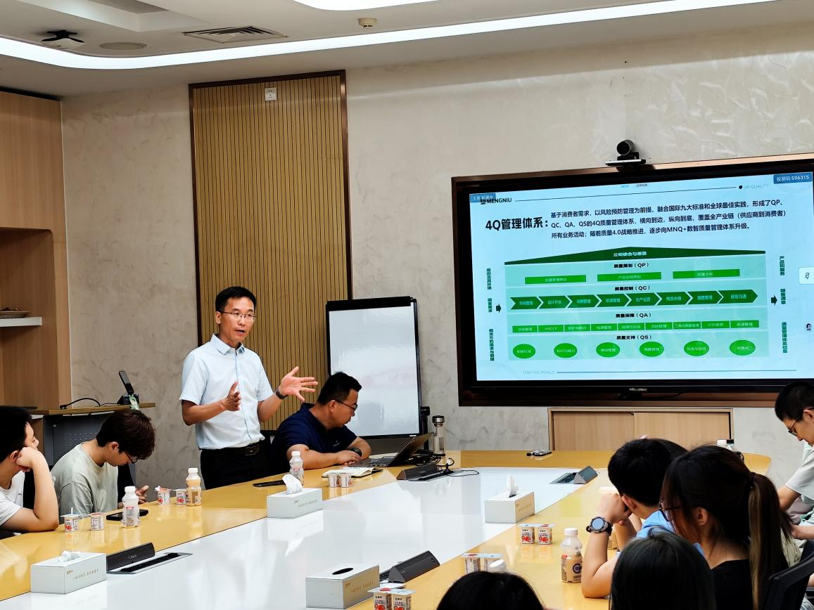 校外导师、蒙牛低温事业部高级质量经理王亮向同学们介绍了蒙牛集团质量管理体系,王亮经理详细分享了蒙牛集团4Q管理体系、合规管理、全链风险管理、消费者为核心的品质控制体系、牧场全链管理、采供管理、数智化质量管理、全场景追溯溯源管理等具体做法,同学们认真聆听并与企业现场互动交流研讨。同学们纷纷表示,企业现场学习更为直观与有趣,提高了同学们对专业的学习兴趣与对专业的认知与自豪感。