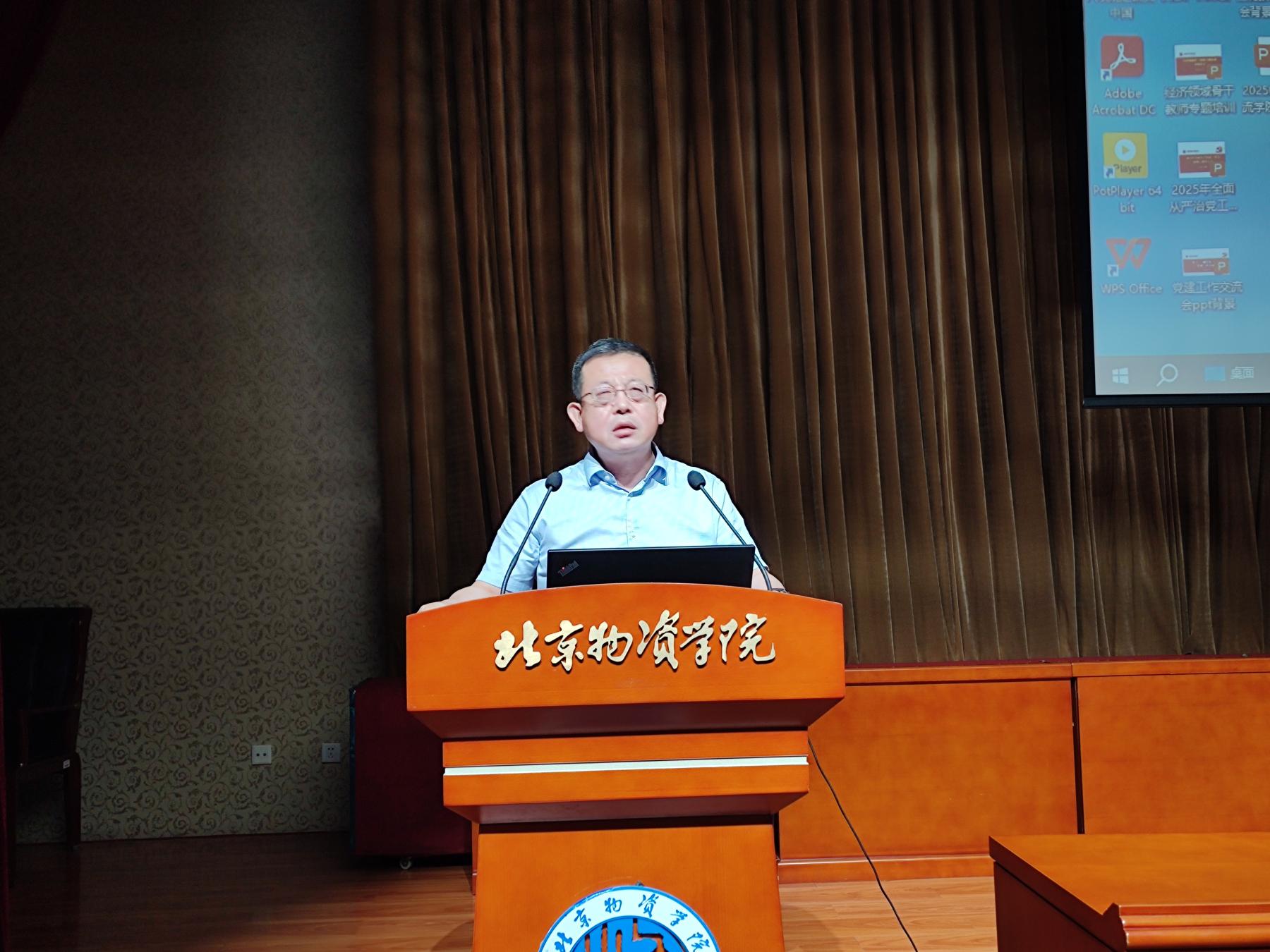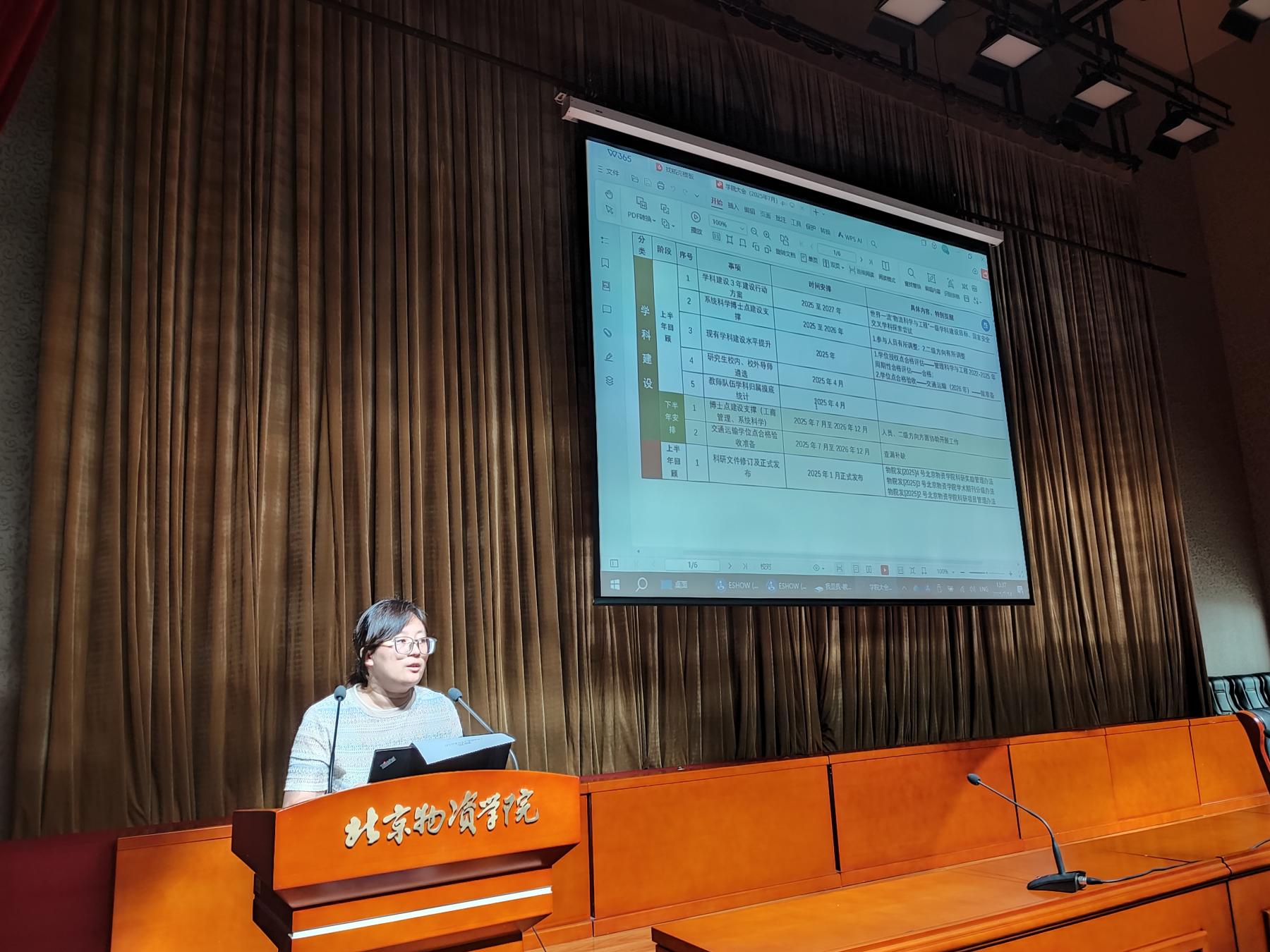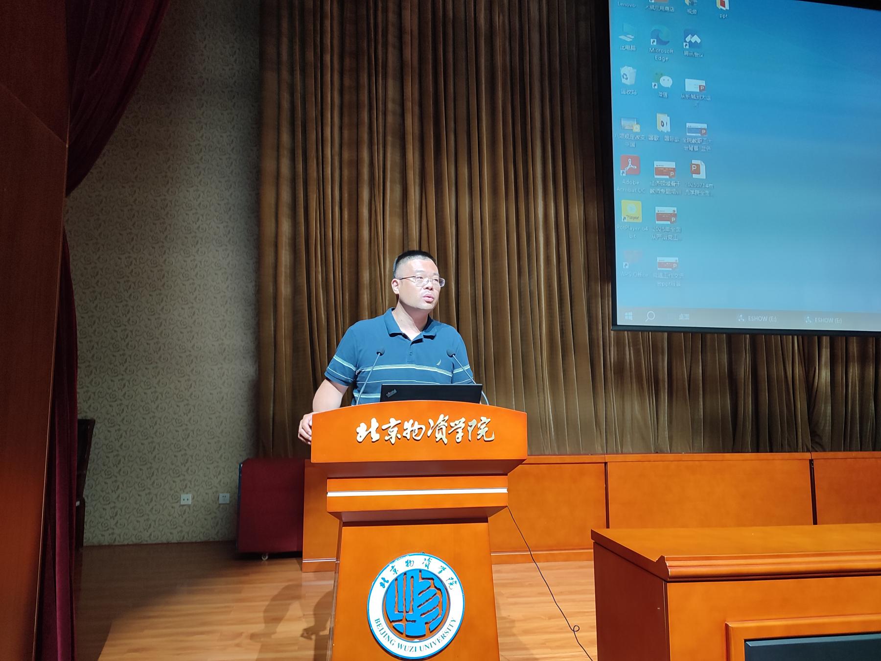 科研副院长刘若阳,首先分析了科研工作“十四五”规划指标完成情况,指出国家级项目及省部级及以上项目数、科研经费等离既定指标还有差距,鼓励专任教师们在项目申报、成果转化上继续努力。然后回顾了2025年上半年学科建设工作,主要支撑系统科学与工商管理两个学科博士点建设,通过了管理科学与工程周期性合格评估,为学校打造物流科学与工程一级交叉学科提供支持。对2025年下半年科研工作安排进行了部署,一是博士点建设支撑,二是交通运输学位点验收,三是科研项目的申报,四是科研学术活动组织开展。接着回顾了2025年上半年研究生相关工作,主要包括2025级研究生招生及录取工作、研究生宣传视频制作、研究生开题及毕业答辩,指出研究生课程排课管理需要进一步规范,2025年下半年研究生的重点工作为2026级的招生及初试工作。最后介绍了“物流师、采购师、供应链管理师”职业能力等级认证培训开展情况,鼓励大家积极参与其中,提升服务社会能力,不断增强学院影响力。