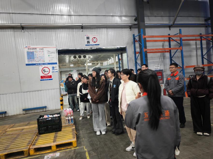 在五环顺通工作人员的热情引导下,学生们先后参观了公司全温度段仓储中心、冷链运输调度区以及城市配送分拣车间。走进仓储中心,不同温度分区的库房规划清晰,从常温仓储到低温冷链区,各类智能仓储设备有序运转,工作人员通过专业系统精准完成货物的入库、盘点、出库等操作,让学生们直观感受到现代化仓储管理的精细化与智能化。在冷链运输调度区,工作人员详细介绍了冷链运输车辆的温控技术、路线优化方案以及全程可视化监控系统,讲解了如何保障生鲜食品、冷冻产品在运输过程中的品质安全,解开了学生们关于冷链供应链 “保鲜密码” 的疑惑。