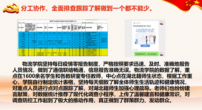 在学校党委领导下,迅速成立防控领导小组,建立微信群,点对点、点对面认真落实学校党委指令,积极做好宣传、统计工作,成效明显。