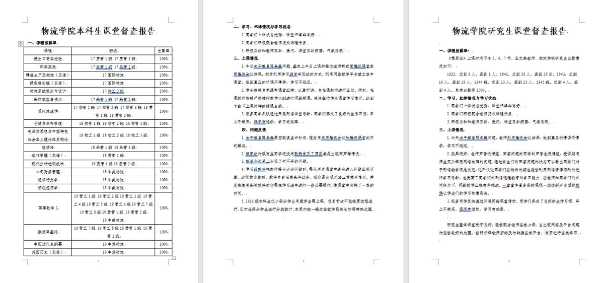 开展线上课堂督察促学风。各年级及研究生辅导员提前掌握各班学生具体课程名称、上课时间等课表情况,每天凭课程邀请码或会议ID进入学生在线课堂进行督查。同时各班临时设置了班长、团支书、学习委员兼职制的在线督查委员,辅助辅导员们一起进行在线课堂学习情况督查。结合辅导员个人查课观察情况和在线督察委员反馈情况,从课堂纪律、到课率、学习状态、网络授课效果、备用授课方案使用等方面每天形成线上课堂教学督察报告,及时提供教学管理部门以供参考改善在线教学质量,及时向各班级进行通报以便纠正不良风气督促提升学风。