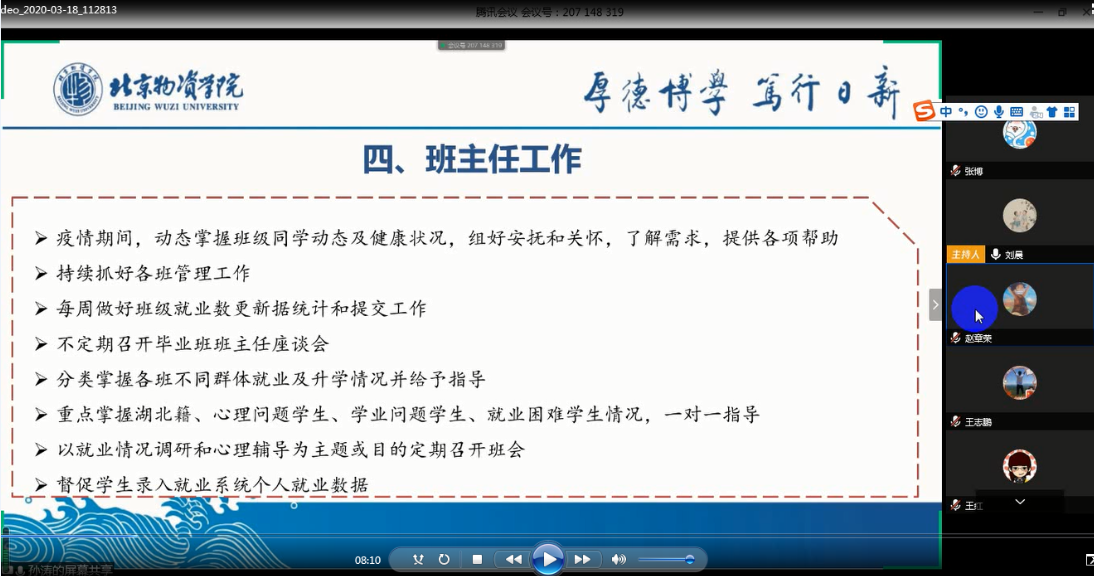 党委书记王红老师对各位老师在疫情期间的辛勤付出表示感谢,同时也要求各位辅导员、班主任老师要用心工作、用情工作,真正的关心、关爱学生,特别是对湖北籍毕业生要开展一对一、点对点的帮扶和指导;要重点加强对考研、考博学生、家庭困难学生、就业困难学生、特殊群体学生就业情况的摸排,一人一册开展有针对性的帮扶和指导;各位辅导员、班主任老师要付出更多的精力,更加用心地持续推进尤物视频