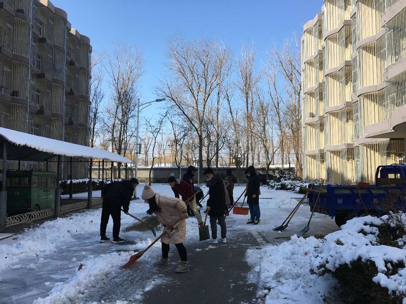 在留校抗疫期间,留校同学也在尽己所能为抗击疫情及维护学校正常工作贡献力量。由于疫情返工困难,教师们复工人手不够,确保线上教学活动的正常开展,留校学生主动帮助老师处理学生事务相关工作。大雪堆积导致出行不便,留校生们一起清扫校园道路上的积雪,为采买生活用品的老师开辟出干净的人行道。