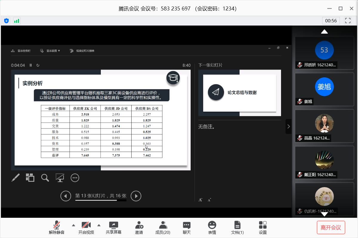 在线上答辩环节中,首先,由答辩组长宣布答辩开始,介绍答辩组成员并主持答辩会议。其次,答辩学生通过共享屏幕展示PPT方式汇报论文的主要内容,随后答辩组成员依次提问、学生作答。最后,答辩组成员经过集体讨论评议,确定答辩结果,并给出答辩学生论文的进一步修改意见。答辩秘书对答辩过程全程录像,并协助答辩组长和答辩学生做好会场的管理和记录。整个线上答辩过程中,答辩学生态度认真,准备充分,陈述重点突出、内容丰富,答辩过程秩序井然,效果良好。
