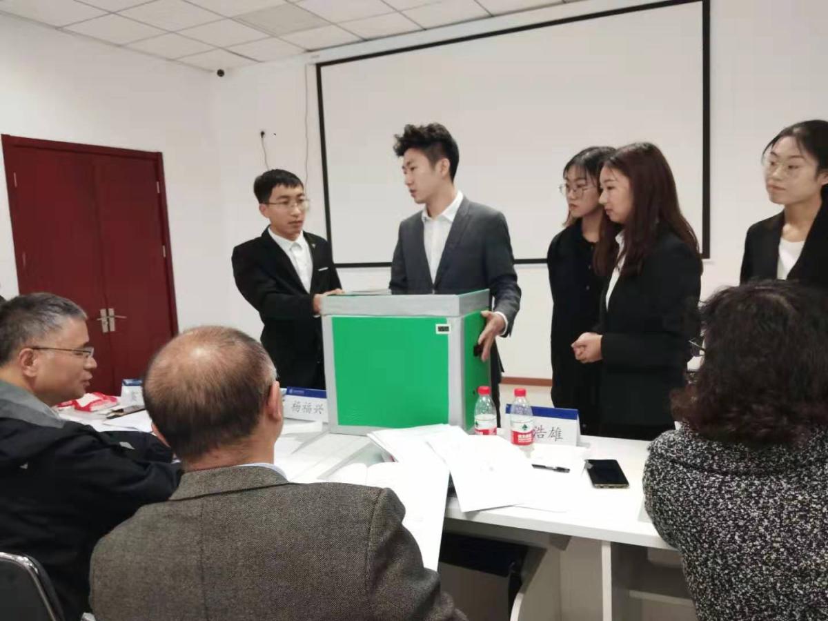 答辩会上,各个项目组都充分展示了项目研究成果,对项目的创意理念、开展历程以及未来研究展望等情况进行了详细汇报,并对专家评委们提出的问题进行了答辩。本年度的大创项目涌现出了许多与现实生活息息相关的研究与创新产品,如医疗设施的创新,易碎包装的设计,河流污水中残留抗生素的研究等等,尤其是一项太阳能式冷热分隔箱的研究项目,同学们针对现代物流对于生鲜类产品的运输需求制作了一款集菌控、氧控、温控于一体的智能运输箱并制作了实体模型,引起了现场专家评委们的浓厚兴趣。