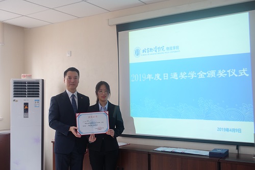 随后,获奖学生代表陆然发言,她表达了获奖的激动心情,感谢日通物流的关怀和赞助,并表示一定会继续努力学习,积极投身到实践中去。在发言后,在场同学借此机会纷纷向日通公司负责人询问相关事宜,对方积极回应,让同学们充分了解了未来的努力方向。最后由杨光副社长和王红书记共同颁奖并与学生合影留念。