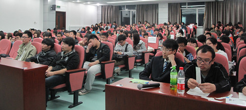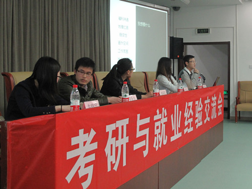 交流会开始后,吕亚鹏老师为此次交流会致辞。吕老师首先感谢了五位学长学姐的到来,其次,吕老师向大家说明了此次交流会的目的,希望大家能在学长学姐的成功经验中有所收获。随后,五位优秀的学长学姐从不同角度介绍了他们对考研和就业的看法以及成功的经验。朱晓宇已经考取了华东理工大学,她认真细致的向大家介绍了她的考研安排,并为准备考研的同学提出了很多复习建议;廖新宇学长已经考取了西南财经大学,他用轻松幽默的语调向大家阐述了他对考研的的看法,就是要保持自己的节奏,放松心态;姚丽莉学姐已经在中捷通信有限公司工作了,她就大学生就业难的问题提出了自己的看法;而目前实习于北京大学第一医院的高超学长则根据自己的实习经验告诉大家该如何准备面试笔试等;最后一位蓝雅颖学姐即将赴法国留学深造,她向大家介绍了留学考研的流程以及合适的时间安排。五位学长学姐的经验分享涉及了目前大学生毕业后面临的所有选择,大家纷纷向学长和学姐提问,现场互动十分活跃。