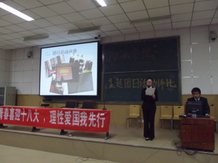 于11月26日在二教1号报告厅开展了“青春喜迎十八大 理性爱国我先行”主题团日活动评比。出席本次活动的嘉宾兼评委有分团委书记何佳赢、12级辅导员鲁楠,兼职辅导员王琦、原尤物视频