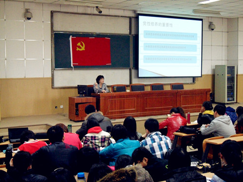 党总支书记张耀荔老师首先向全体党员介绍了党总支近期以来的工作以及对未来党总支工作方向的展望。随后进行了关于“加强党员修养,提升思想境界”的主题报告。她号召全体党员坚定科学的理想信念,树立正确的世界观、人生观、价值观,同时更强调,我们大学生党员应该加强党性修养。因为加强党性修养是实现党所肩负的历史使命的现实需要,加强党性修养是保持党的先进性的重要条件,加强党性修养是全面提高党员队伍素质的基本工程。我们应该在学习当中升华自我,严于剖析自我,自觉实践贵在坚持更重要的是从我做起,从点滴的小事做起。