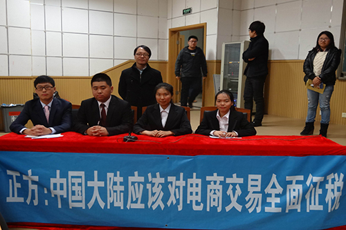 作为正方首先抛出观点,通过概念解读、现状分析,以清晰缜密的思路证明本方的观点。而在盘问中,双方各执一词、分毫不让。在接下来的驳论和对辩中,气氛更是紧张激烈,反方辩手一句“A货充斥电子商务交易市场,收税不公”引起的辩论更是让赛事趋向白热化。虽然反方辩手步步紧逼,但正方辩手也毫不示弱,以大量事实来护卫本方的观点,口齿清晰,措辞精辟,恰到好处。在自由辩和总结中,双方犀利的言语、针锋相对的辩驳更是让人印象深刻。