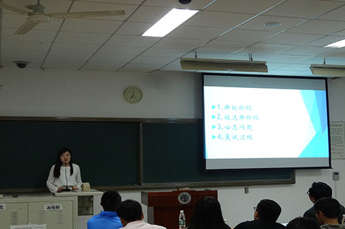 交流会上,第一个发言的是考取北京工业大学机械专业的丁斌同学,他总结出考研成功=2000小时+正确学习方法+收集正确信息,并为大家解答了是否报考研班、专业课资料怎么找、如何选择合适学校、要不要提前找导师等考研学生普遍关心的问题。考取延边大学的刘亚婷同学重点分享了考研调剂的经验,她提醒大家在择校阶段要和学校所在地的高中同学了解学校的详细招生信息,时刻关注考研帮论坛以及学校官网的调剂信息。在备选阶段,要注意系统填报后主动给研招办的老师发送邮件,诚恳的表达自己的意愿。其他几名同学也纷纷上台分享了自己的考研经历和经验。