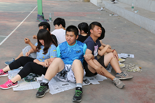 第二个游戏是考验团队凝聚力的风火轮。成员需要把报纸用胶条连成一个圈。每组选出四人进入圈内,如同传送带一般前进。从场地的一端走到一端,用时最少组获胜。第三个游戏是一块五毛,这是一个集体游戏。每个女生代表“一块”,男生代表“五毛”。当裁判报出一个价钱后,“一块”和“五毛”要迅速组合成这个价钱。而零散的“钱”就要面临淘汰的结局。“一块”和“五毛”们在场地中央围成一个圈。指挥者喊出了“一块五”,场上顿时沸腾了,“一块”开始寻找“五毛”;有的三个“五毛”组合被硬生生地拆开;两个“一块”抢一个“五毛”。这是一场脑力与体力的较量。第四个活动,顾名思义,即小组人员背对背将手互挽集体起身完成后再进行跳长绳,用时短组获胜。