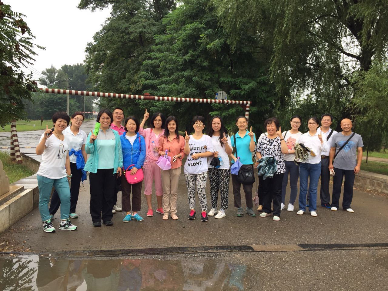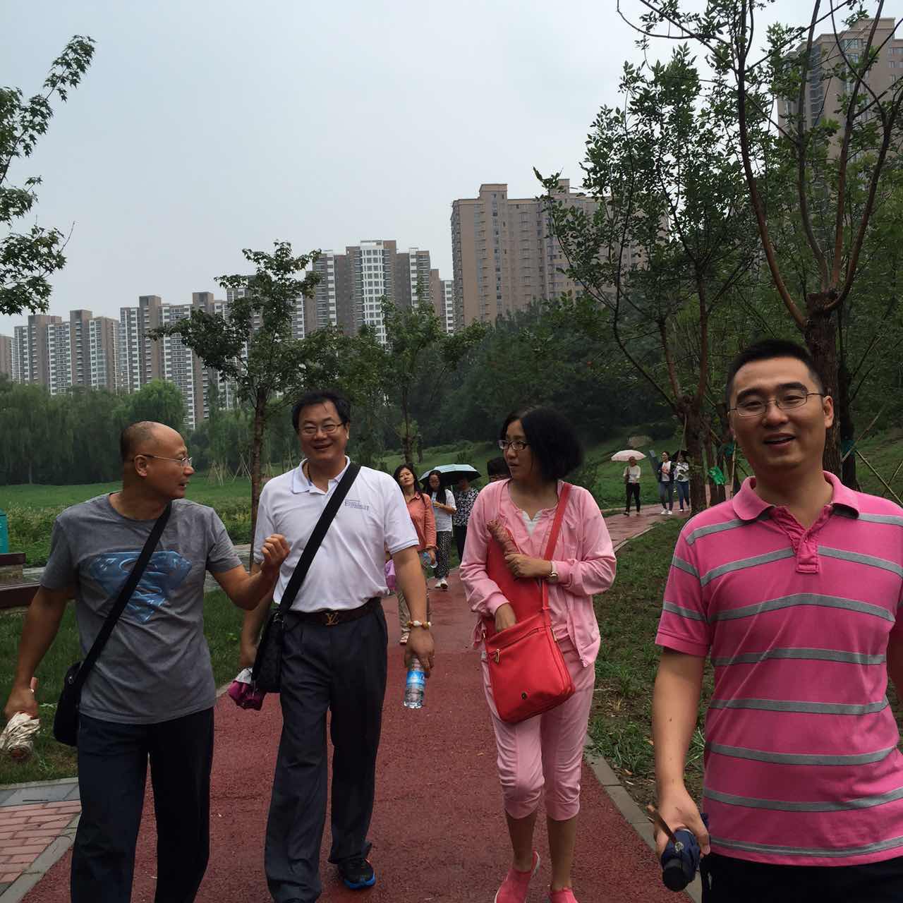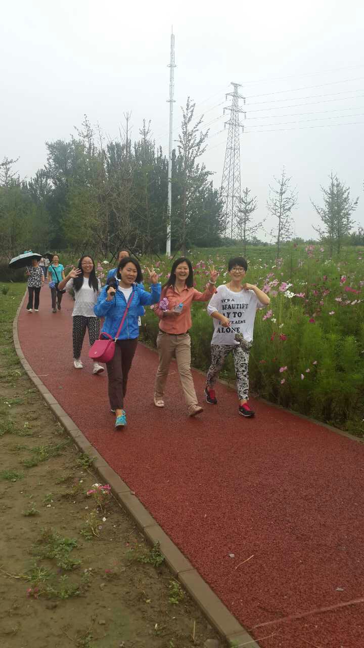 正门,经学校北门、榆景苑南侧路向东到达通州区商务园西大堤路,往北直行至折返点后,再原路返回,终点设在学校北门。虽然空中飘着点点雨滴,但参加活动的老师们热情不减,一路漫步在平坦的林间小路中,行走之余也不忘欣赏河畔通州商务园滨河公园内的美景。老师们纷纷表示,徒步活动对教职工的身体健康很有帮助,既放松了身心、实地感受了通州城市建设的新变化,又振奋了精神、以饱满的热情投入到即将开始的新学期工作中。
