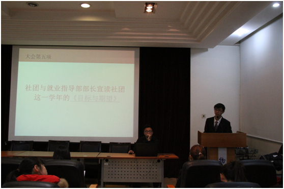各社团发言完毕,接下来由社团与就业指导部部长谢华龙宣读社团一学年的目标与期望。社团与就业指导部部长在目标与期望中强调,社团与就业指导部将和各社团协调合作,要求社团积极开展各项活动,并让社团的活动更加丰富多彩。
