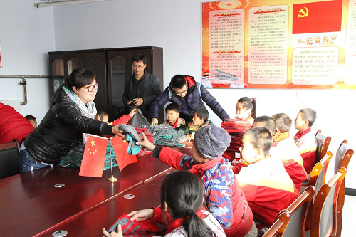 十分钟后,孩子们下课了。校长将受资助的学生还有几位家长带来了会议室与老师和同学们进行交流。校长一一介绍了这些受资助的学生们以及他们的学习情况。在得知孩子们的学习成绩都十分出色时,杨洪璋老师显得很兴奋,他亲切的对孩子们说:“你们一定要努力学习,记住,读书能改变命运,别的都不行。”之后杨洪璋老师又同学生家长进行了交谈,他提出,希望家长们能尽自己最大的努力积极配合学校,配合老师,让孩子们都能出色的完成学业。同时杨老师也表示,我们所能出的力,带来的东西和钱都并不算多,但是东西是有数的,爱心是无价的,而大学生能为孩子们带来的又何止是捐款和爱心。接受教育对于孩子们来说并不是意味着要离开这里,而是能走的出去、能改变,能走得多远、能有什么样的改变,全部源于现在受到什么样的教育。最后,杨老师亲手将捐助款交到每一位受资助学生的手中,并为孩子们分发学习用具和体育用品以及由一位社会人士捐赠的毛线围脖。老师和同学们帮助孩子们把围脖都戴好,也许这些围脖和其上加注的关爱会使孩子们度过一个温暖的冬天。
