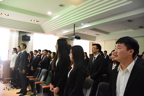 在大会的一开始,与会人员全体起立,奏唱国歌。国歌奏响,全体师生肃然起敬,目视鲜红的国旗高唱国歌。紧接着大会的第二项,由毛文富老师为主席团成员颁发聘书,朱晓婷老师为各部门部长颁发聘书。受聘同学依次走到台前,从老师手中接过聘书并与老师们合影留念。
