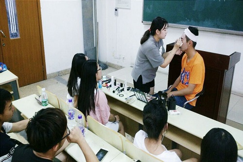 在培训课程中,化妆培训师们向同学们详细地介绍了护肤用品和彩妆用品的基础知识,使用的方法、步骤和技巧,使同学们对一般的化妆用品和材料有了基本而全面的认识。以丰富的舞台化妆经验和专业前卫的化妆发型设计理念,为同学们悉心传授日常妆、适于不同活动的主持人妆以及不同类型的舞台妆上妆技巧和注意的要点。老师们特别提出,即使在上同一类妆时,男生和女生在上妆手法上也要有一些区别,要分别对待。另外,化妆时还需根据每个人不同的相貌体态特征、不同的发型着装特点、不同的舞台造型人物形象,进行多种不同的化妆技巧和妆发色彩搭配方式。化妆需要因人而异、随机应变,只有这样才能保证在台上的人员能突出其鲜明的形象特征、神态气质,人物轮廓更加显著传神,使化妆达到锦上添花的效果。