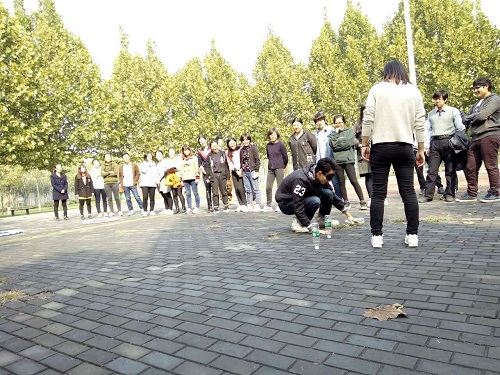 秋天虽然早已有些寒意,可惠民绿地上却热火朝天,参加比赛的同学活力无限,周围观战的同学欢呼呐喊着为自己组的成员加油助威。裁判认真地看着比赛的同学的动作,时不时看下手中的秒表。比赛如火如荼地进行,同学们的呐喊声在惠民绿地一遍遍回荡,每个人都在用自己的实际行动证明着自己想要为自己的队争光,赢得奖励。