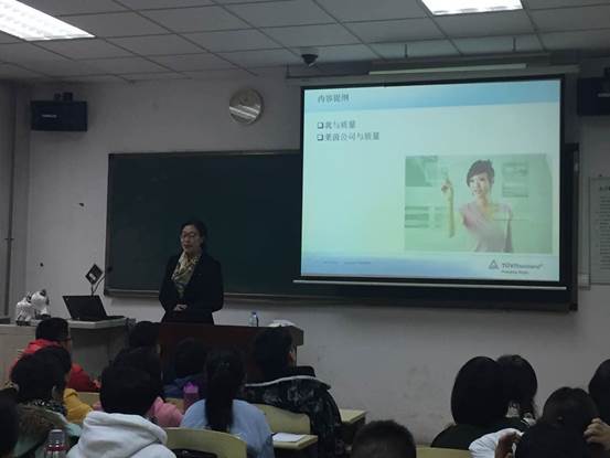 质量管理工程专业邀请,来到我校为质量管理工程专业为2016级新生进行现场授课。MS. Linda作为莱茵TUV集团首席运营官,同时兼任莱茵大中华区政府关系副总裁,具备多年质量检测、评估、认证、认可等行业经验,并且对于质量人才现状及发展趋势具有较强的市场评估能力。质量管理工程专业教师出席旁听了此次课程。