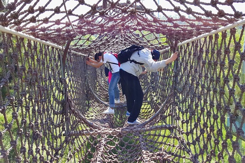 跟随向导的引领和一路讲解,同学们首先对整个农场园区的规模和经营规划有了大概的了解,步行千余米便来到了本次团建的第一个活动地点——“模拟红军长征路”。在这一项目中,老师和同学们要攀爬三段规格形式不同的绳索栈桥,每段栈桥都有对应的长征线路为主题,分别为:“瑞金开端”、“四渡赤水”和“激战腊子口”。在攀爬的过程中,老师和同学们往往需要手脚并用才能站稳在摇晃不定的绳索上,在通过一些跨度较大的踏板或低矮的通道时,还不时要测过身子一步一步的在绳索上腾挪或弓着腰深一步浅一步的艰难前行。