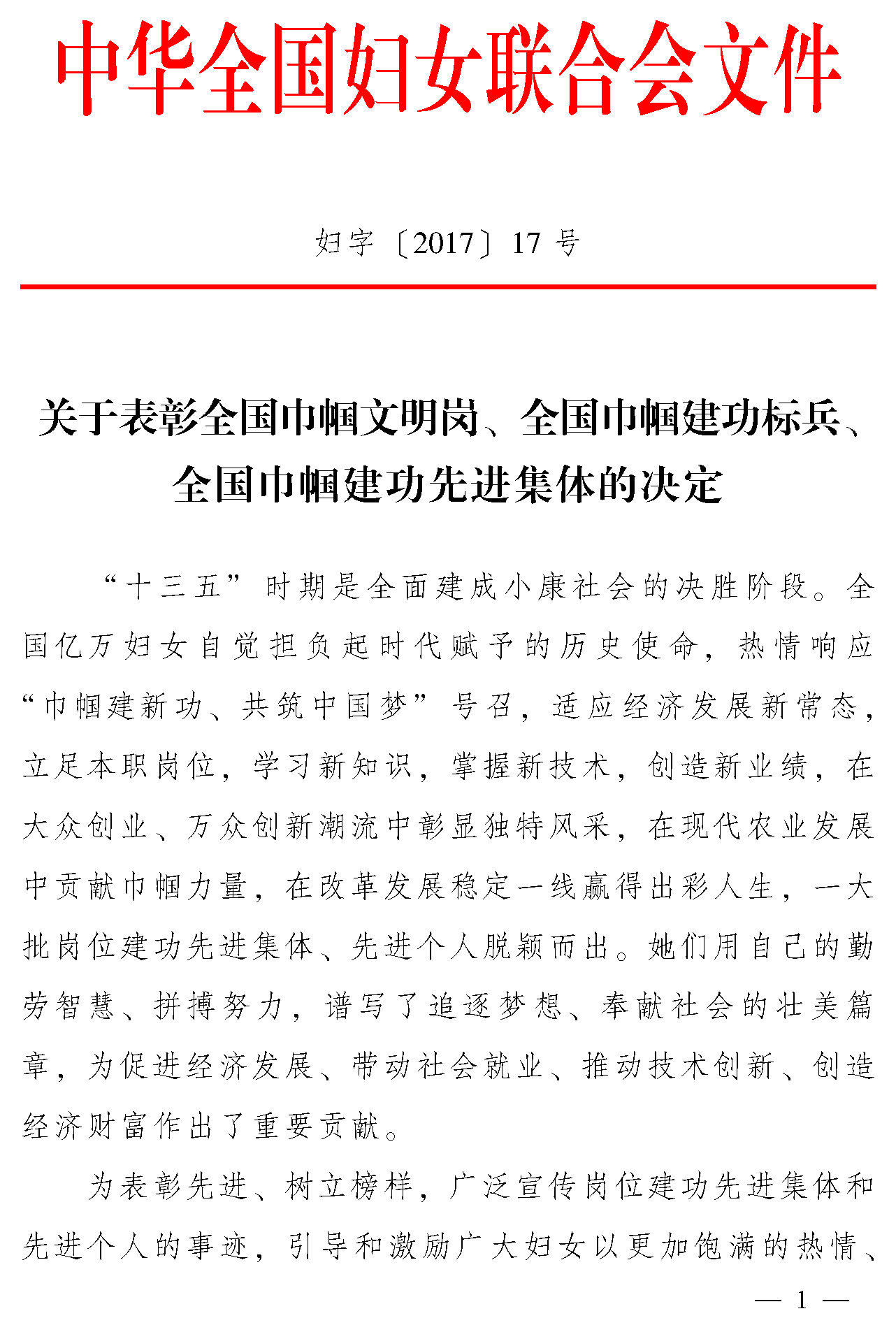 为贯彻落实党的十八届历次全会精神,全面落实中央党的群团工作会议部署,2017 年 4 月 19 日,全国妇联印发《关于表彰全国巾帼文明岗、全国巾帼建功标兵、全国巾帼建功先进集体的决定》(妇字〔2017〕17 号),对全国城乡妇女岗位建功先进集体(个人)进行表彰。我校尤物视频