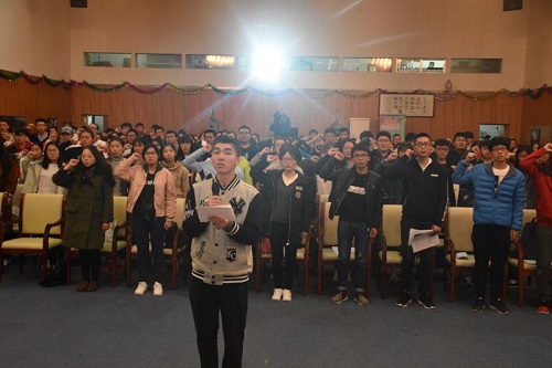 在培训尾声时,霍金华老师和全体志愿者们起立,庄严宣誓志愿者宣誓词。