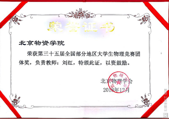 荣获第三十五届全国部分地区大学生物理竞赛团体奖。负责本次比赛的刘红老师受到了表彰,其它参赛的同学因为有华为杯的奖励,坚定了自信,非常感谢华为集团对青年学生的大力支持和肯定。为我校学生参赛扩大了获奖面。
