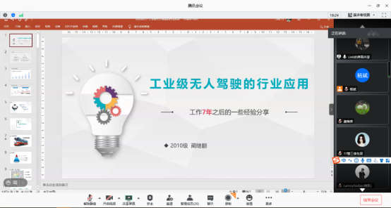 物流管理专业通过腾讯会议的形式举办了“物流名家讲座2”第二讲。此次讲座邀请了北汽集团旗下九曜智能科技公司商务&销售部部长蔺继翻校友作了题为《工业级无人驾驶的行业应用》的演讲。参加此次讲座的有尤物视频