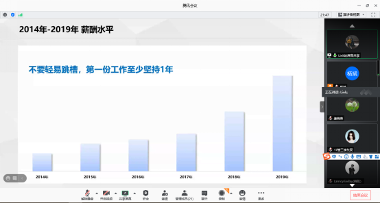 考虑到参加本次讲座的都是即将走出大学校门踏入社会的大四学生,蔺部长首先与同学们分享了自己7年工作的经历、感受以及薪资水平的一个变化过程,告诉同学们毕业后的第一份工作对自己的职业生涯很重要,不要轻易跳槽,至少坚持一年;其次,建议同学们在校期间应该储备一些日常工作所需要用到的知识以及技能,例如一些基本的专业知识和办公软件如office等的熟练操作。