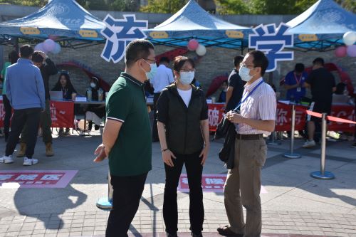 迎新点,与学院报到负责老师、新生辅导员和志愿者们亲切交谈,详细询问新生入校审核的具体细节,深入了解迎新工作的具体情况,对各工作点情况进行慰问与视察,并对迎新工作的开展提出了指导意见。