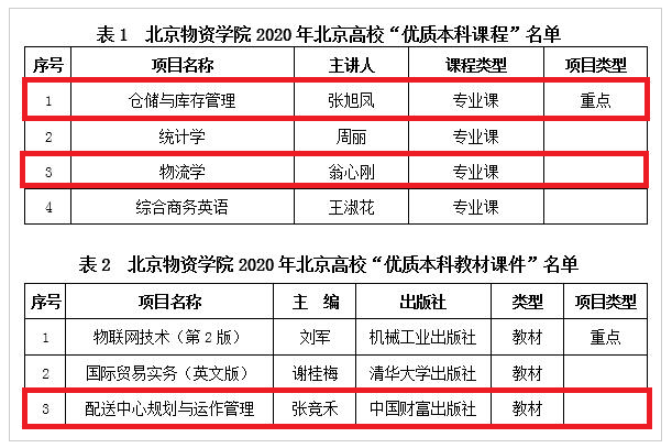 2020年10月16日,由张旭凤院长、刘俐、梁晨、赵琨和解晓灵教师团队建设的《仓储与库存管理》课程以及翁心刚副院长、温卫娟、唐秀丽、张竞禾和安久意教师团队建设的《物流学》课程分别被认定为2020年北京高校重点“优质本科课程”和2020年北京高校“优质本科课程”;同时获批“优质本科课程”的主讲人被认定为“北京高校优秀专业课主讲教师”。