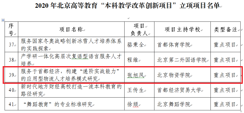 2020年10月12日,由张旭凤、何明珂、温卫娟、李彦萍、梁晨、芮嘉明和田雪等老师组成的教研团队申报的《服务于首都经济,构建“递阶实战能力”的应用型物流人才培养模式研究》,获得2020年北京高等教育重点“本科教学改革创新项目”。