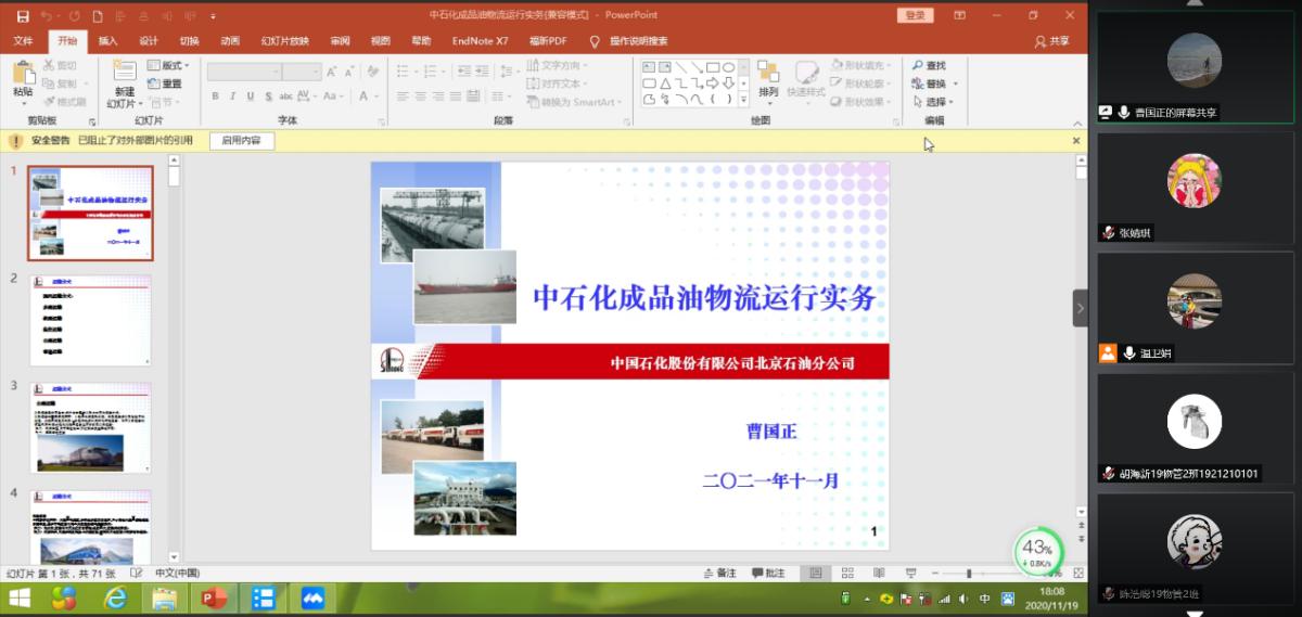 2020年11月19日晚18:10,物流管理专业“物流名家讲座”课程第十讲开讲。本次邀请到中国石化股份有限公司北京石油分公司物流中心副经理曹国正老师,讲座主题为《中石化成品油物流运行实务》,由物流管理专业温卫娟老师主持,物流管理本科生及部分尤物视频