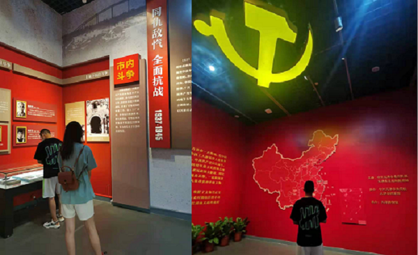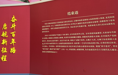 在序言“风雨如晦盼日出”展区,实践团了解了天津早期共产主义的初步发展,包括“理想传播”“伟大觉醒”等方面。第一篇章“开天辟地”介绍了天津市1927-1937年“困境斗争,抗日救亡”、1937-1945年“同仇敌忾,全面抗战”、1945-1949年“争取和平,夺取政权”三大阶段。第二篇章“奠基立业”介绍了1949-1978年间,天津人民在土地改革、抗美援朝、探索三大改造等方面取得的伟大成就。第三篇章“富国裕民”介绍了市场经济、科学发展在天津市的应用与发展。第四篇章“复兴伟业”则从十八大以来创新发展、抗击疫情等角度解释了“以人民为中心”的发展思想以及“五位一体”“四个全面”在天津的扎实实施。
