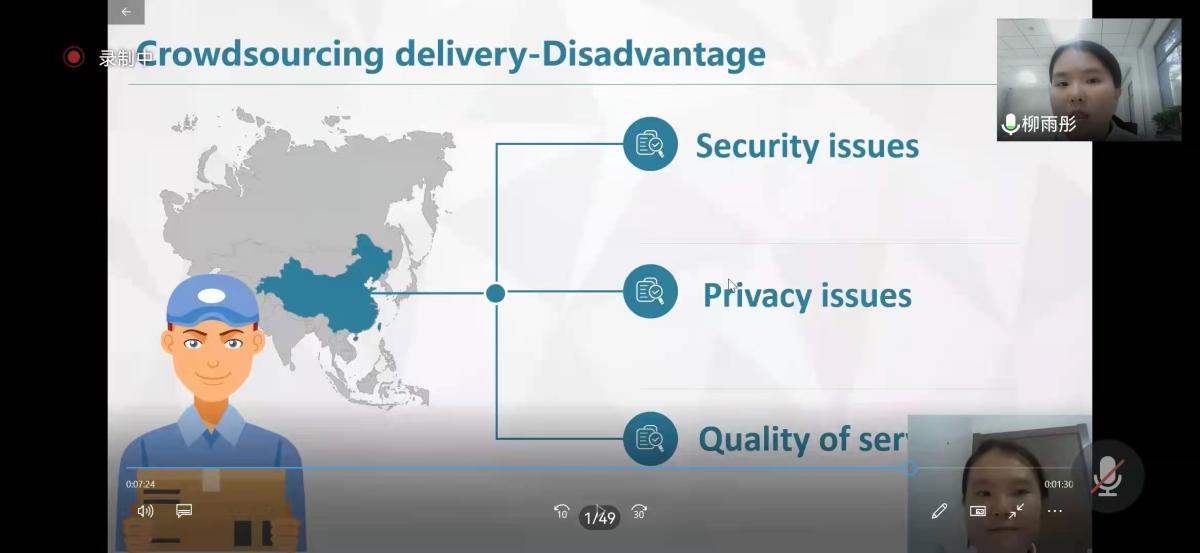 最后,柳雨彤老师以“零工经济下的最后一公里配送-众包配送”为主题为同学们带来演讲。柳雨彤老师认为零工经济已经成为未来用工的大势所趋,众包物流作为''互联网+''下的产物,对于最后一公里配送有着技术基础以及天然优势。