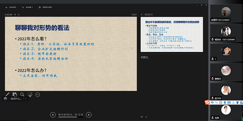 此外,刘军院长还着重分析了2022年就业形势,详细分析了四种易陷入的就业误区,建议广大毕业生同学立足当前、时不待我,面对社会的不断进步,要着眼时代发展、胸怀国家需要,做顺应时代的弄潮儿,闯属于自己的一片天。