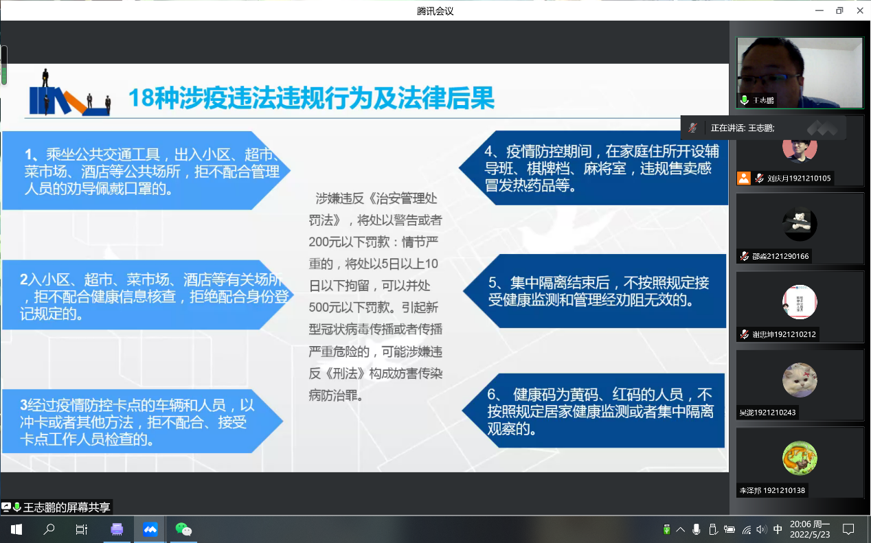 授课开始后,党支部书记王志鹏首先向同学们介绍了目前全国各地特别是北京的疫情防控形势,特别是近期社会面出现的中铁十一局三公司、海淀友谊社区等几起聚集性疫情案例,要求大家从思想上要引起重视,不扎堆、不聚集、非必要不流动、非必要不外出;随后,结合近期社会面以及高校出现的违反疫情防控相关法律和规定的案例,要求大家要脑中有法、用心守法,自觉遵守属地和学校的疫情防控要求,按要求佩戴口罩、严格落实居家观察、主动配合流调溯源、不信谣、不传谣;最后,希望大家调整好心态,严格落实每日健康打卡、疫苗接种应接尽接的要求,调整心态,严以律己,认真做好线上学习、期末备考、论文写作、求职就业。