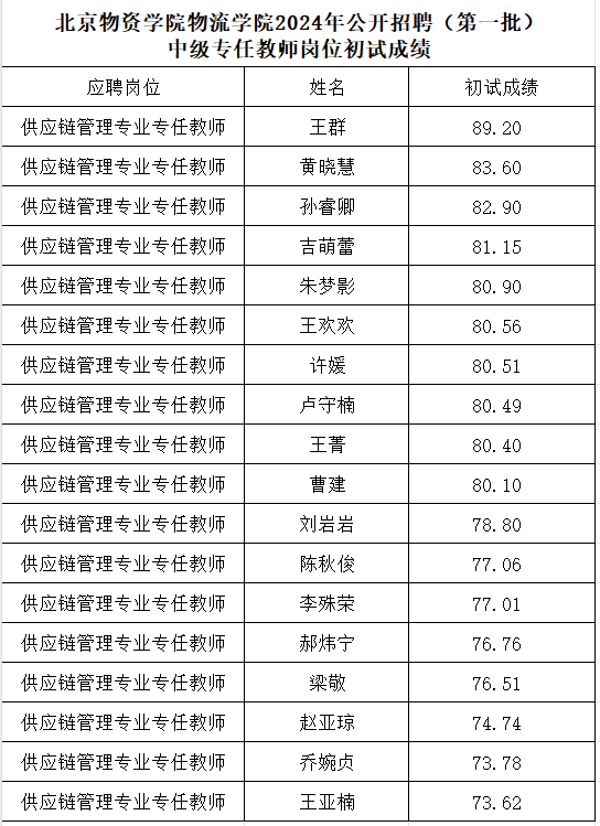 尤物视频 2024年公开招聘(第一批)中级专任教师初试成绩公告 来源: 发布时间:2024-04-01 浏览次数: 次 根据《尤物视频 2024公开招聘(第一批)公告》,尤物视频 供应链管理专业专任教师岗位初试采取学术水平及教学能力专项考核、面试考核的形式,成绩计算方法为:学术水平及教学能力专项考核成绩占30%、面试考核成绩占70%。现将初试成绩予以公布。 尤物视频 2024年4月1日