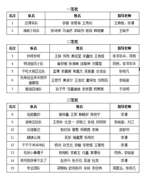 “华鼎冷链科技杯”数智供应链大赛获奖结果公示 来源: 发布时间:2025-07-15 浏览次数: 次 “华鼎冷链科技杯”数智供应链大赛共收到32支参赛队伍的报名材料。经专家组对参赛方案文本进行初评,筛选出16支队伍进入现场答辩环节,其中1支队伍因故弃权,实际参与答辩的队伍为15支。 根据大赛评分办法,最终成绩由方案文本评审成绩与现场答辩成绩按权重综合计算。经评审组严格评定,2支队伍获得一等奖,5支队伍获得二等奖,8支队伍获得三等奖,共15支参赛队伍获奖。 现将评审结果予以公示。公示期为即日起至2025年7月16日。如对评审结果有异议,请在公示期内向大赛组委会实名反馈。 大赛组委会2025年7月13日